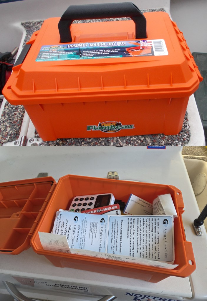 The Compact Marine Dry Box by Flambeau is perfect size for me (9.625″ L x 7.5″ W x 4.25″ D) and checks several other boxes. It’s rugged and waterproof due to the rubber gasket that seals out water when the end-hinged (like an ammo box) lid is shut and latched down. It’s bright orange. I keep it in a storage compartment along with other gear – first aid kit, a tool kit, zip lock bags and other items. When I need it, I can locate it at a glance. If I forget to stow it away, it’s heavy enough that it won’t blow out of the boat at highway speeds.