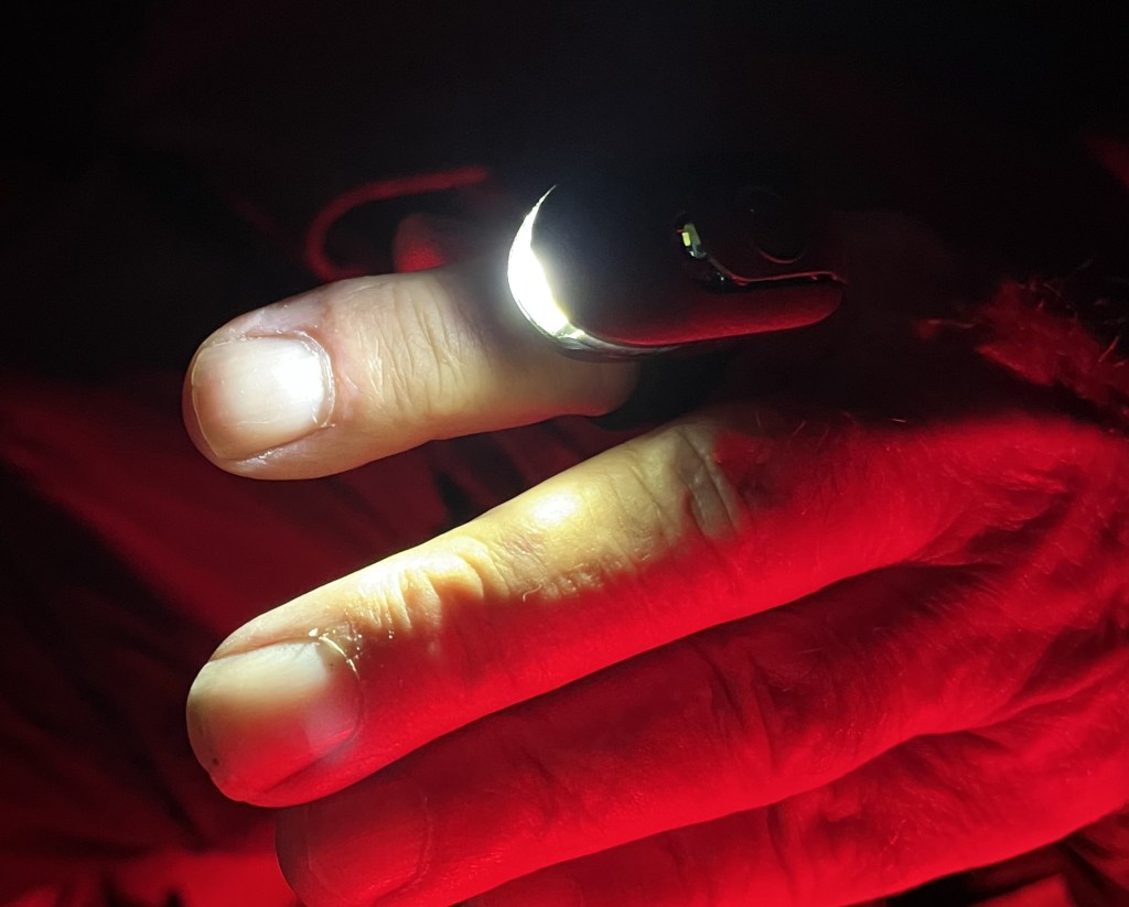 I got one of the Fingerlights and put it to use immediately. The salmon run was on and I started the day long before dawn. I’ve put red interior lights in my boat to help preserve my night vision, but they won’t light up the counters on my downriggers or diver rods. The Fingerlight will. Or it will light up the inside of my glove compartment where small tools work their way to the back. Or it will light-up the oil filter on my tow-vehicle where some auto engineer thought it would be funny to mount it right above the front axle.