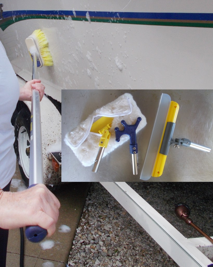 For quick wash downs, applying liquid wax or hand polishing, switch to the end with the soft, synthetic sheepskin pad. The “pad on a stick” cuts washing/waxing time by about 4X. Then finish the windows (or other flatter surfaces) with a with a silicone squeegy attachment. One pass and the water is gone. Check out this kit and other Swobbit Products at http://www.swobbit.com. Available in-store at many retailers or on-line at Amazon or the Swobbit website.