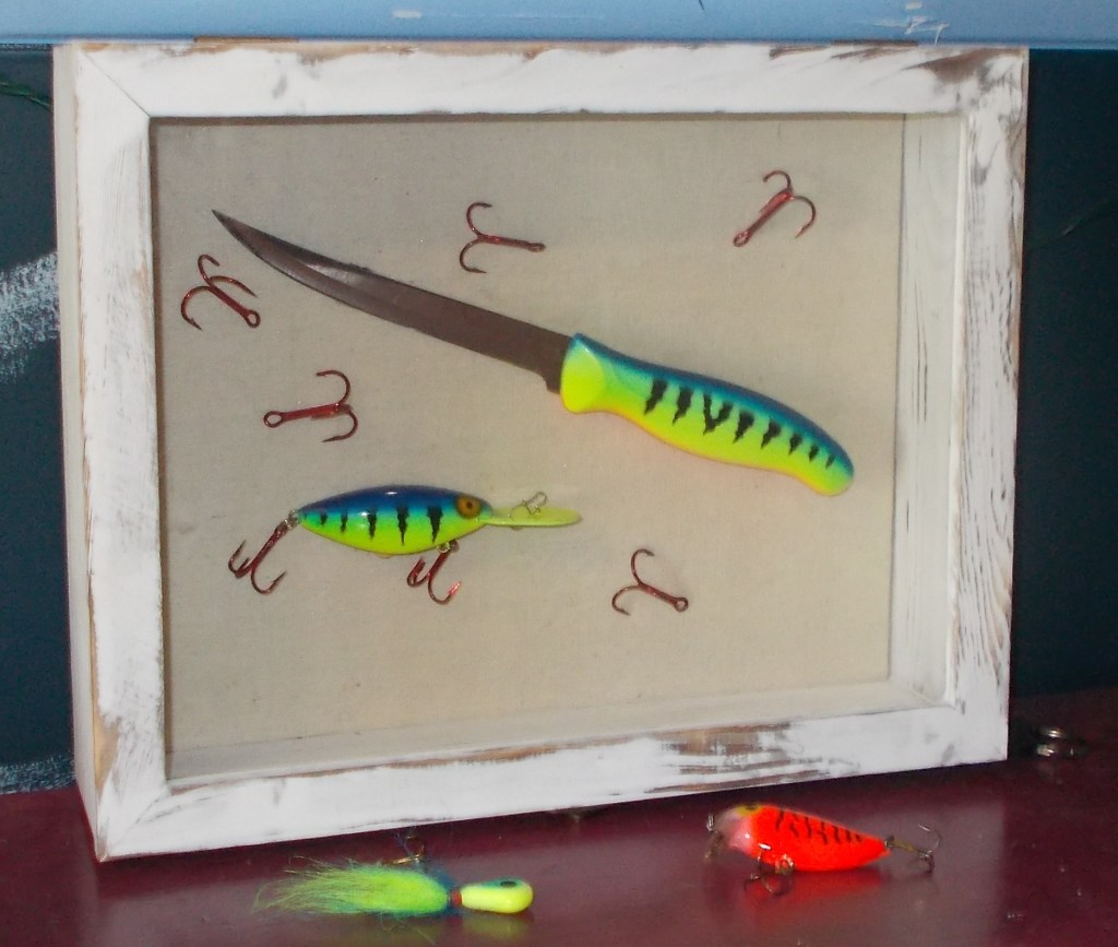 I instantly wanted one but not to just add to my fish cleaning kit and dazzle fellow knife wielders at fish cleaning stations. I wanted one to add to the “outdoorsy” decor of my office/work room/man cave. So I sent Dane a magnum “original” Hot ‘n Tot and a filet knife, asking him to paint each of them in a matching Blue Tiger color. Once I got them back, I mounted them in a shadow box.