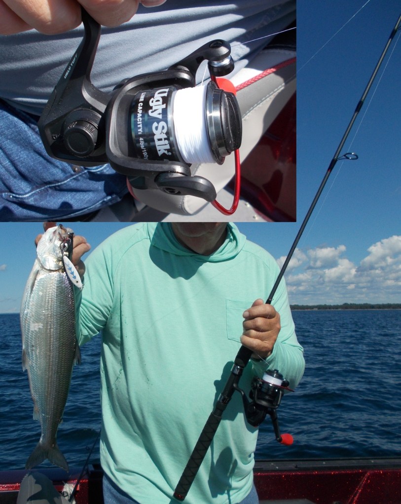 I spooled it up with 10-pound braid. On my cisco fishing trip, the fish we were catching were hooked 120 feet or more below the surface. Fishing extra-deep with many small reel makes extra work just because of the amount of cranking it takes to reel in the fish. At almost 30 inches per turn of the handle on the reel on this combo, the ciscoes came to the top without an unduly amount of reeling.