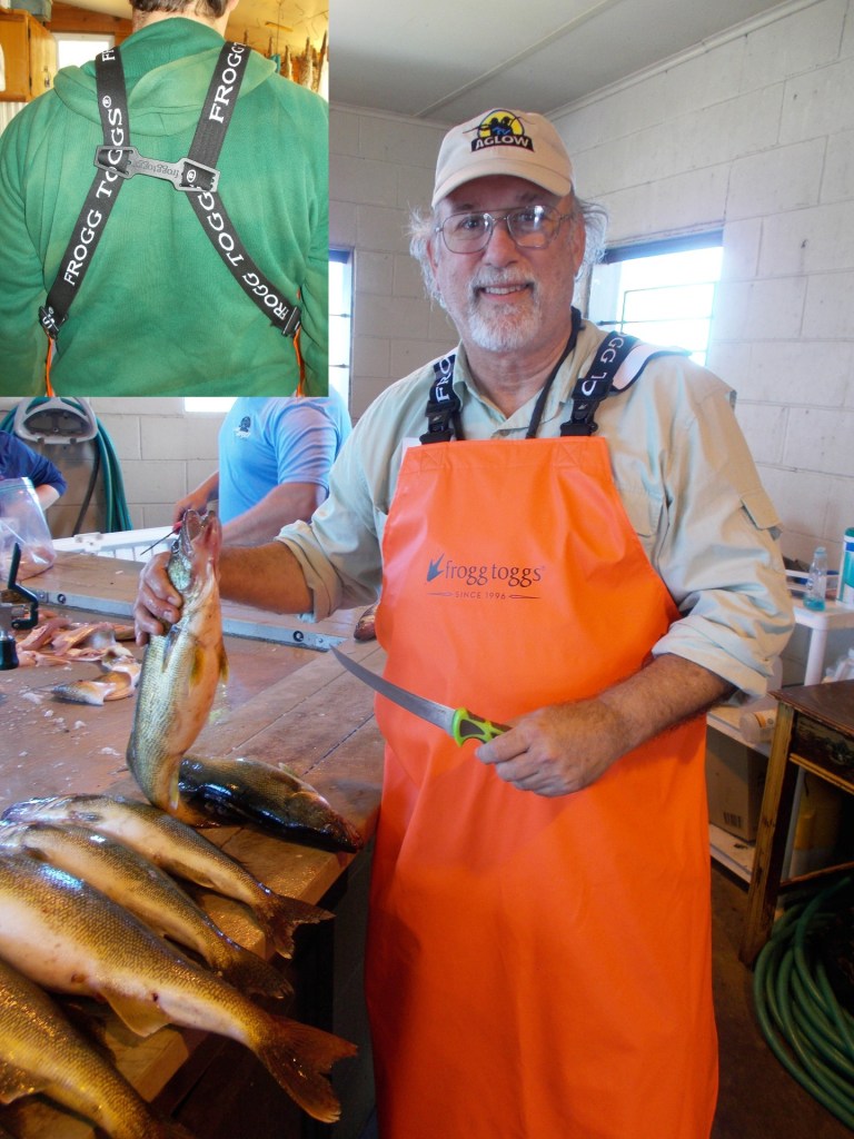 I examined them closer. First, the apron is made from a thin, tough-feeling vinyl, not from any of the modern fabrics that go into most Frogg Toggs raingear, or from the paper-like material associated with the original FT rainwear. That’s good. The vinyl material is perfectly waterproof (and thus fish blood and slime proof) and nearly stainproof – at least fish blood won’t stain it. Just rinse it clean after being used.