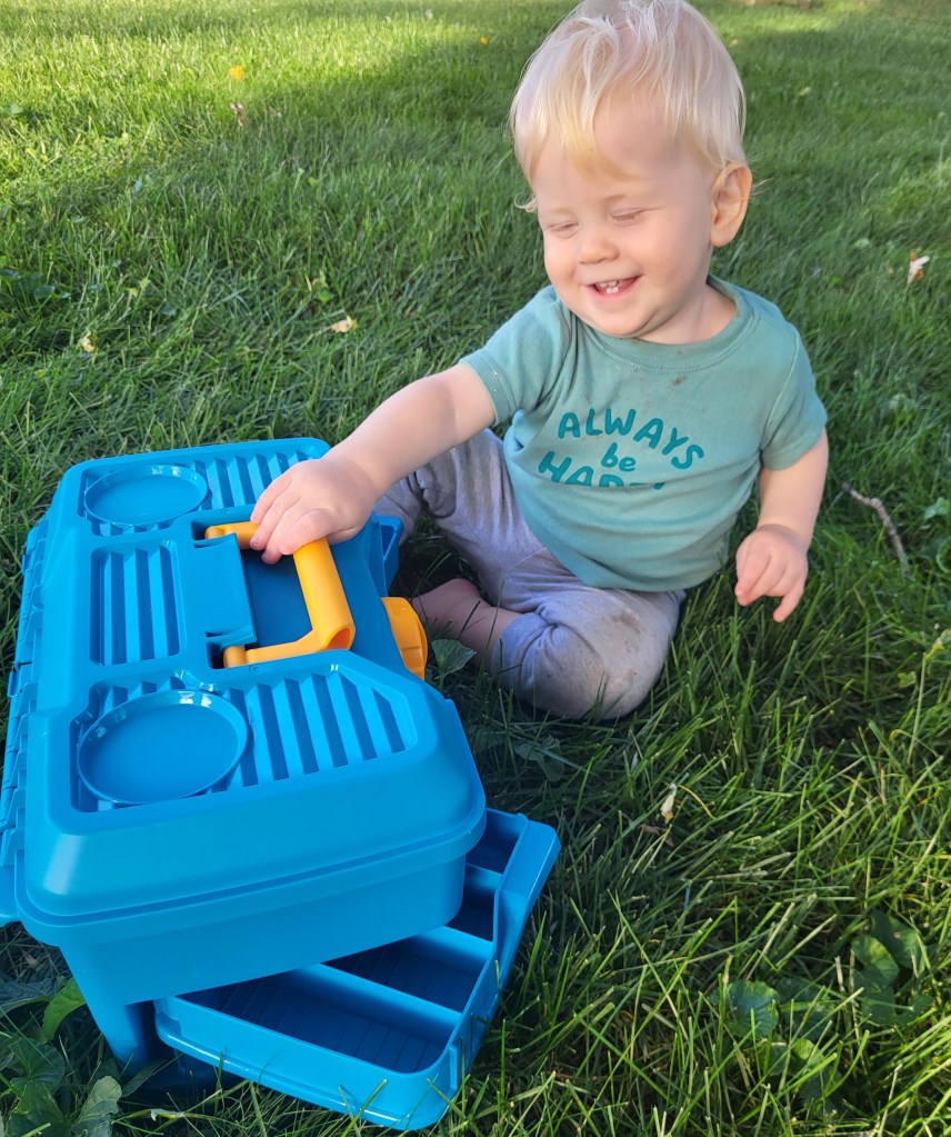 Andrew is way too little to fill the box with hooks, bobbers and other fishing gear, but I knew he’d be attracted to the bright blue color of the box, the bright yellow handle and closure knob and have fun opening and closing the top and swinging out the drawers to fill them with other bright plastic toys. I was right about that.