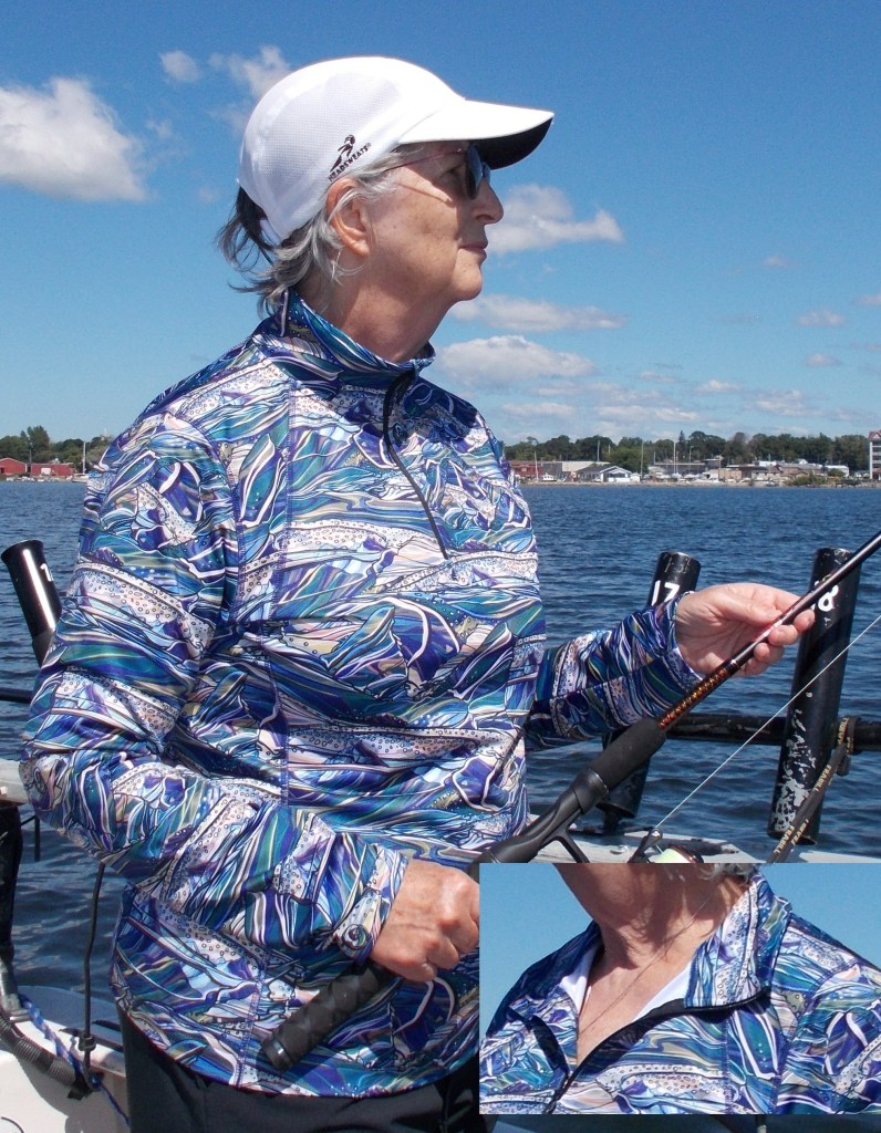 She chose the Thermal ¼ Zip top in the Rainbow Ridge pattern. Like all of Fishewear’s patterns, it’s a spectacular mix of colors, this one with a continuum of blue hues from light to dark so vivid the trout, wind, water and waves create a vibrant, eye-catching shirt.